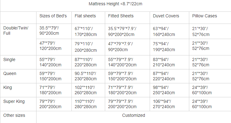 Hotel Bedding Sets Size Chart
